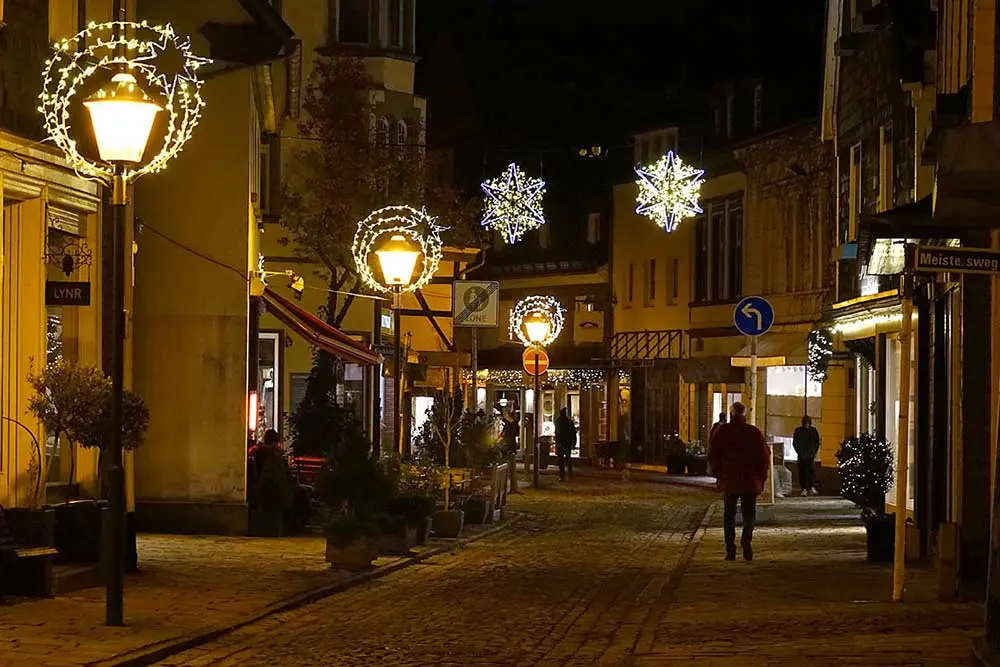 Am ersten Adventswochenende, also an diesem Wochenende, findet das Adventsdorf in Kettwig statt. Wer dem Trubel der großen Märkte in Essen entfliehen mag, ist hier genau richtig, denn hier kann in familiärer Atmosphäre gepunscht und gesnackt werden. Besonders schön sind die Holzhütten an der Kirche am Markt, am Weberbrunnen, vor der Kirche St. Peter und vor dem Petershof. Beim sogannten Adventsdorf-Rundgang »Folgt dem Stern« könnt ihr mit einem Glühwein durch die mit Lichterketten und Lichtinstallationen geschmückte Altstadt schlendern und die charmante Kleinstadt mit im Lichterglanz entdecken. Dazu gibt es ein familienfreundliches Programm mit Konzerten, Rudelsingen, Lesungen und Mitmachangeboten.