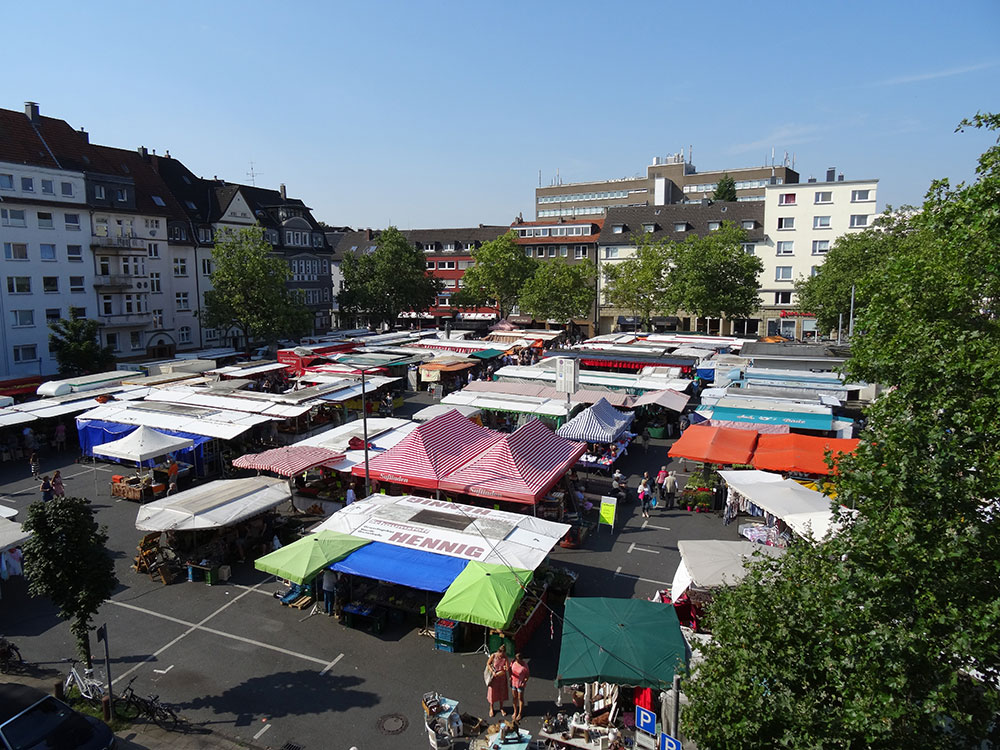 Ein Spaziergang auf der Rü ist immer eine gute Idee - am Samstag könnt ihr ihn direkt noch mit einem Besuch auf dem Wochenmarkt kombinieren. Der hat von 8 bis 14 Uhr geöffnet. Hier findet ihr nicht nur ausgefallene Käsesorten, italienische Backwaren oder Bio-Fleisch aus der Region sondern auch saisonales Obst und Gemüse, wie die heimische Superfoods Grünkohl, Rote Bete und Rosenkohl.